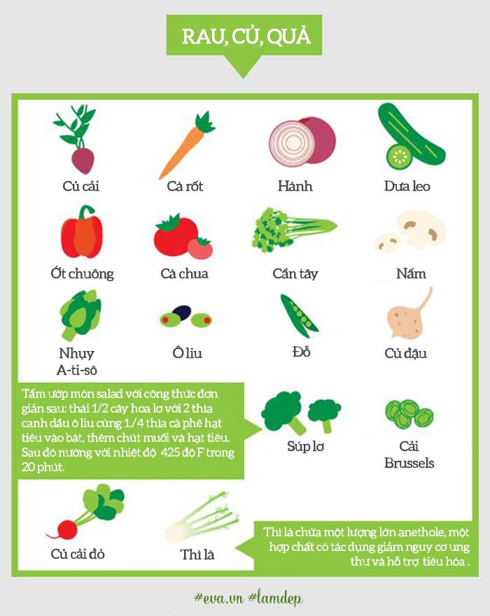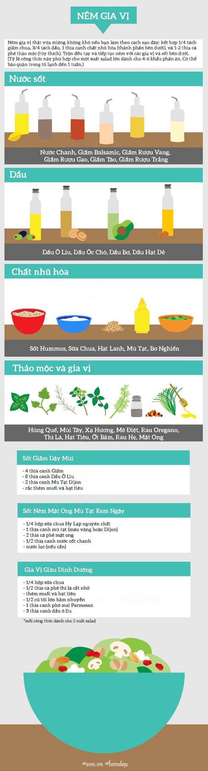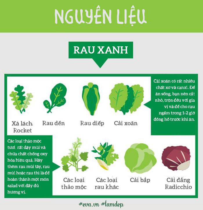 Với công thức salad, nàng cần phải cầu kỳ hơn một chút. Trước tiên, ta phải bắt đầu với bốn thành phần chính để làm nên một món salad ngon và đủ dinh dưỡng: rau xanh, thực phẩm chứa protein, rau hoặc trái cây và các loại sốt, gia vị. Ngoài ra bạn có thể thêm ngũ cốc và các món khoái khẩu không dầu mỡ khác theo ý thích, nhưng chú ý là chỉ thêm vào với tỷ lệ nhỏ thôi nhé!