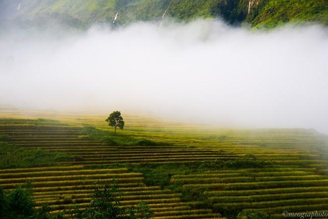 Những vạt mây bồng bềnh trong thung lũng, quyện với màu vàng óng ả của