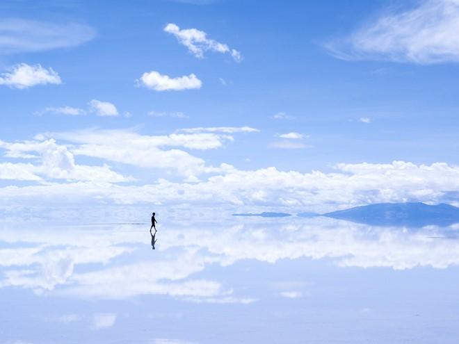 Salar de Uyuni, Bolivia: Đồng bằng muối khổng lồ này giống như chiếc gương phản chiếu mây trời, tạo thành khung cảnh siêu thực như ở hành tinh khác.
