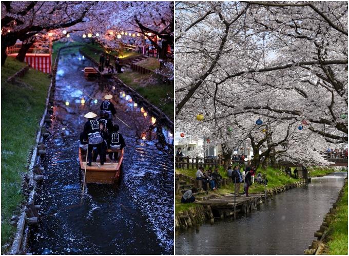 Cách thủ đô Tokyo chỉ khoảng 30 phút di chuyển bằng tàu điện, Kawagoe thuộc thành phố Saitama là một trong những điểm ngắm anh đào hút khách du lịch ở Nhật Bản. Những cây anh đào trắng như tuyết, uốn cong từ hai bên bờ tạo nên đường hầm anh đào đẹp mắt, chỉ một cơn gió nhẹ là cánh hoa rơi lả tả, phủ đầy mặt sông trông như bong bóng xà phòng.