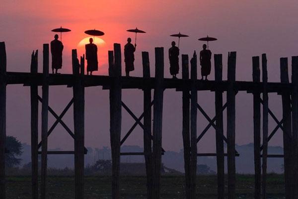 2. Cầu U Bein - Myanmar: Cầu U Bein là một trong những nơi tuyệt đẹp để chiêm ngưỡng hoàng hôn ở châu Á. Những người đam mê nhiếp ảnh đã đến đây để bắt lấy khoảnh khắc mặt trời lặn bên hồ Taungthaman. Hình ảnh quen thuộc xuất hiện trong các bức hình là các vị thầy tu hay người dân địa phương trên chiếc xe đạp di chuyển qua chiếc cầu gỗ tếch trong ánh sáng mặt trời tắt dần về phía tây.
