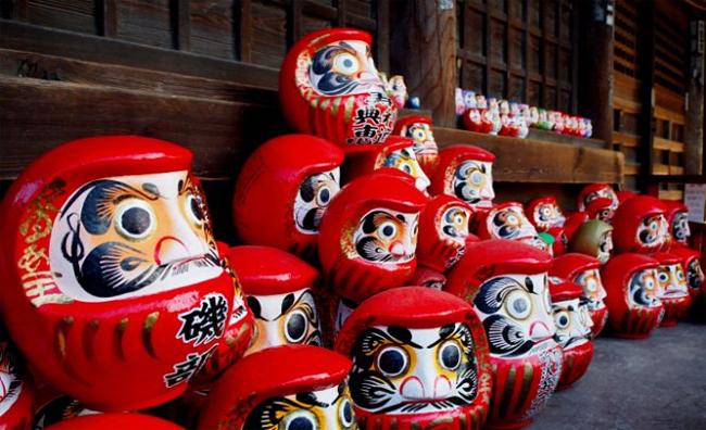 Một trong những món đồ lưu niệm nổi tiếng mà du khách thường mang về từ Nhật Bản là búp bê Daruma. Đây là những con búp bê bằng gỗ, hình tròn sơn màu đỏ, có ria mép lớn màu đen và đôi mắt trống rỗng.