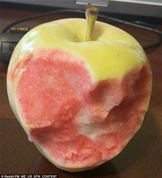 Quả táo xanh có ruột màu hồng kỳ lạ khiến nhiều người khiếp vía.