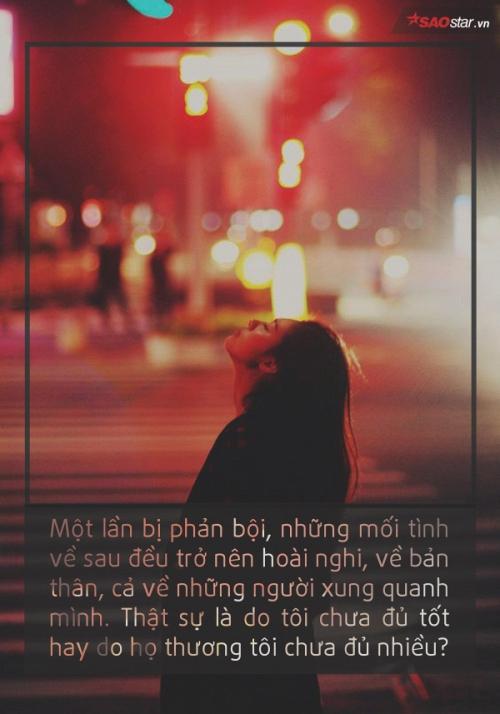 Sau khi trải qua nhiều lần yêu thương như vậy, ai cũng lặng lẽ rời đi. Cho dù có là người giỏi giang đến mức nào cũng trở nên hoài nghi chính bản thân mình. Vì sao những người đó cứ lần lượt mà đi, không ai ở lại cùng mình đi đến cuối đời? Là mình đã làm sai nhiều chuyện đến mức họ không thể thứ tha được ư? Tự vấn biết bao nhiêu câu hỏi, tự dày vò mình với những lỗi lầm thậm chí chẳng phải do mình gây ra. Thật sự không biết phải cố gắng đến bao nhiêu mới gọi là đủ tốt để giữ chân từng người một.