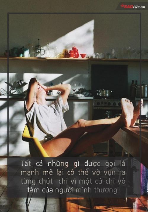 Hóa ra yêu thương lại khiến con người có những phút yếu lòng đến thế này. Những tưởng bản thân luôn có thể mạnh mẽ, không chuyện gì không thể vượt qua, hóa ra cũng có lúc gần như mất đi toàn bộ lí trí, chỉ muốn vỡ òa trong nước mắt, ngồi xụp xuống vì những tổn thương trong lòng. Chuyện hàn gắn những vết thương ấy cũng chẳng hề đơn giản như những vết trầy ngoài da, biết đến khi nào mới lành, biết đến khi nào mới thôi không nhức nhối nữa?