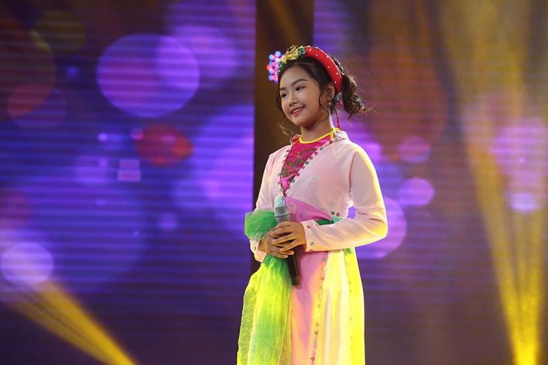 Cô bé Nguyễn Đỗ Khánh An hát ca khúc "Lời ru" trong bộ áo tứ thân nhẹ nhàng.