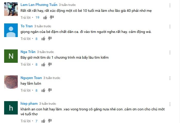 Tuy không nằm trong top triệu view trên Youtube, nhưng phần thi của Nguyễn Đỗ Khánh An (10 tuổi đến từ Hà Nội) cũng đạt xấp xỉ tới 700 nghìn lượt xem. Không thể phủ nhận giọng ca tài năng, truyền cảm của cô bé này khi thể hiện xuất sắc tinh thần của bài hát Lời ru trong tập 4 chương trình.