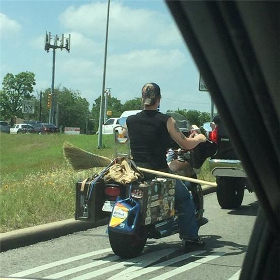 Ủa, có chổi bay sao không đi mà lại đi mô tô vậy?