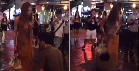 Một clip ghi lại cảnh chàng trai quỳ xin lỗi, kéo tụt cả váy người yêu giữa phố