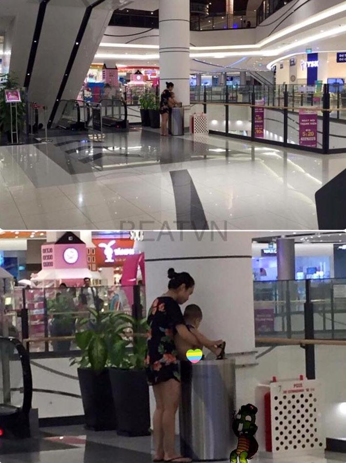 Hình ảnh bà mẹ trẻ cho con đi vệ sinh vào thùng rác ở TTTM khiến cư