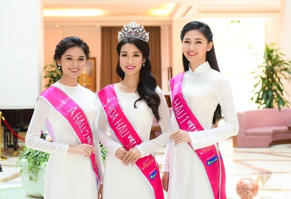 Cả ba người đẹp diện áo dài trắng thướt tha và duyên dáng. Tuy cùng chất liệu, những mỗi trang phục lại sở hữu những đường nét rất riêng. Tân Hoa hậu Đỗ Mỹ Linh diện thiết kế cổ thuyền đính kết hạt trai. Chiếc vương miện trị giá 2,2 tỉ đồng điểm xuyến những hạt ngọc trai bản lớn phù hợp với những nhấn nhá của trang phục. Trong khi đó, Á hậu 1 Ngô Thanh Thanh Tú xuất hiện trong một chiếc áo dài truyền thông, toát lên vẻ thanh thoát và tôn chiều cao ấn tượng của người đẹp. Á hậu 2 Huỳnh Thị Thùy Dung lại hút ánh nhìn do làn da sáng của người đẹp phù hợp cùng chất liệu lụa trắng.