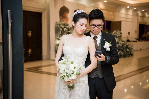 Vợ chồng trẻ chăm sóc và vui vẻ trò chuyện khi nhận được hàng trăm tin nhắn chúc mừng ngày lễ thành hôn