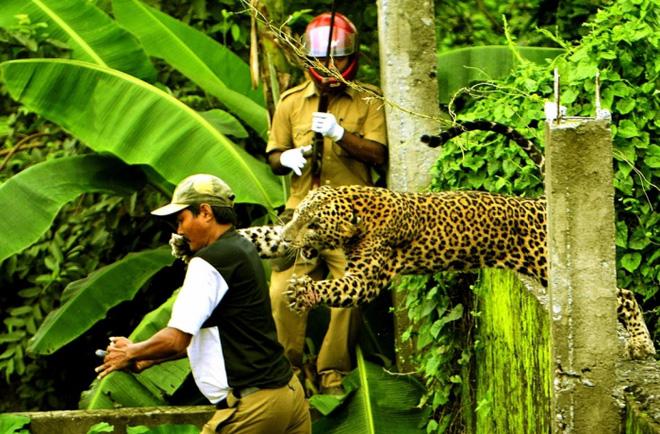 Con báo này đã trốn khỏi Khu bảo tồn Động vật Hoang dã Mahananda, phía tâyTây Bengal. Bức ảnh này được chụp trước khi nó tấn công người đàn ông áo đen và bị người đàn ông cầm súng bắn chết.