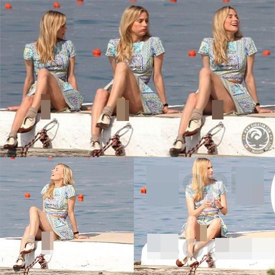 Diane Kruger diện váy ngắn màu xanh hiệu Dolce & Gabbana kết hợp xăng đan cao gót. Nhưng người đẹp vẫn cố ngồi lên mặt bàn để chụp hình và kết quả là hớ hênh hết sức.