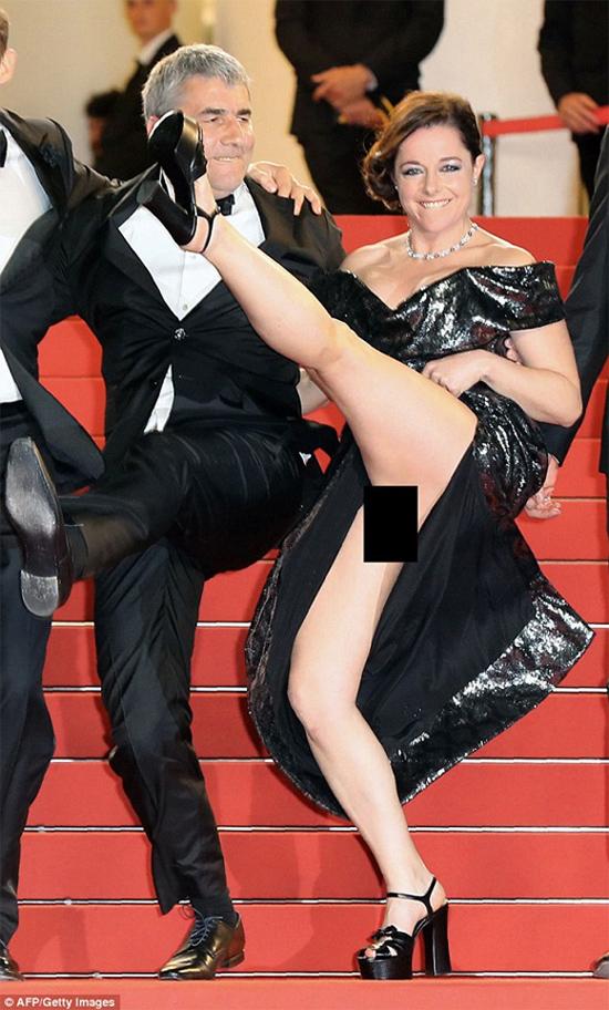 Trong ngày thứ 2 của Liên hoan phim Cannes lần thứ 68 năm ngoái, Sophie Marceau kém duyên vì màn vén váy quá đà lộ "bàn tọa" bên trong.