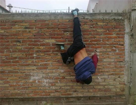 2. Tên trộm kẹt chân trên hàng rào, treo ngược người trên tường