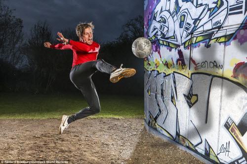 John Farnworth, 30 tuổi, có thể tung ra 28 cú đá vô lê liên tục trong vòng chưa đầy 30 giây. Chàng trai người Anh này cũng đang giữ kỷ lục người kiểm soát bóng trên dây lâu