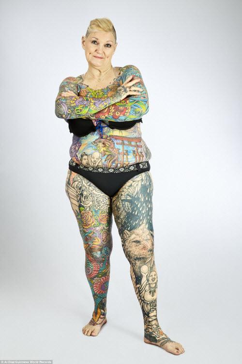 Charlotte Guttenberg và Chuck Helmke, đến từ bang Florida ở Mỹ, được xác định là những người cao tuổi sở hữu nhiều hình xăm trên cơ thể nhất trên thế giới. Bà Guttenberg (ảnh), 67 tuổi, có 91,5% cơ thể được phủ bằng hình xăm, trong khi ông Helmke, 76 tuổi, có 93,5% cơ thể được che bằng hình xăm.