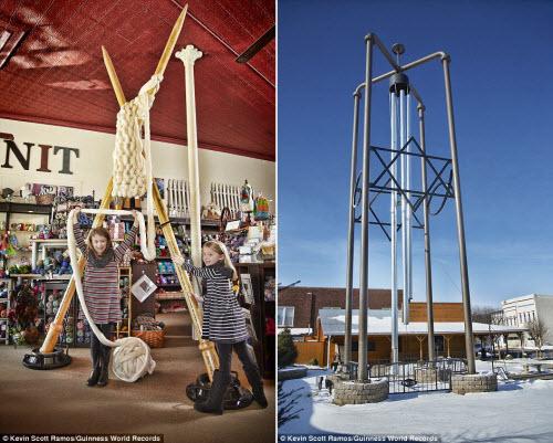 Cặp kim đan len lớn nhất thế giới (trái) có chiều dài gần 4m được chế tạo bởi Jeanette Huisinga. Chiếc chuông gió lớn nhất thế giới với chiều cao 13m được trưng bày tại thị trấn Casey, bang Illinois, Mỹ.