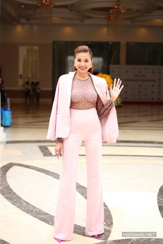 Thanh Hằng là một trong những sao Việt tích cực lăng xê mốt khoe nội y. Cô phối bra-top ren đen cùng bộ suit dáng rộng cùng tông khi dự một sự kiện diễn ra đầu tháng 3/2016.