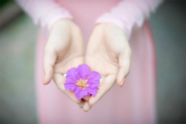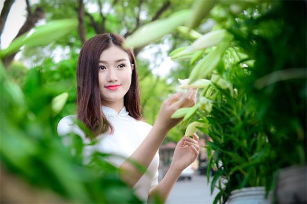 Thiếu nữ e ấp bên sắc hoa trắng tinh khôi.