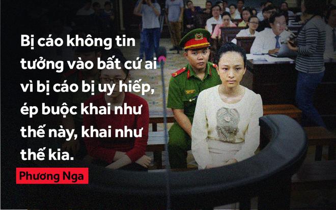 Khi đại diện Viện KSND xét hỏi: "Bị cáo có cho rằng mình im lặng sẽ bất lợi", Phương Nga cho biết: "Bị cáo chấp nhận. Bị cáo không tin tưởng vào bất cứ ai vì bị cáo bị uy hiếp, ép buộc khai như thế này, khai như thế kia. Một tuần trước khi phiên toà này mở ra, bị cáo mới đồng ý cho luật sư Nguyễn Văn Dũ ghi lời khai của mình".