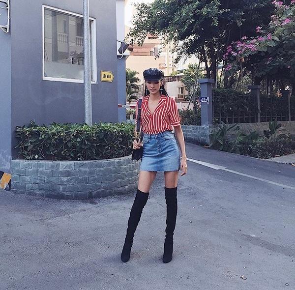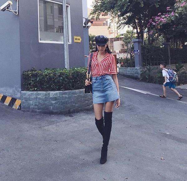Đây là phong cách thời trang thường ngày của Hoàng Thùy. Khoe đôi chân dài trong chiếc chân váy denim chữ A cài cúc kết hợp cùng áo sơ mi kẻ sọc, Á hậu không quên diện thêm vài món phụ kiện như boots cao cổ, nón baker và túi xách nhỏ nhắn giúp set đồ "chất phát ngất"