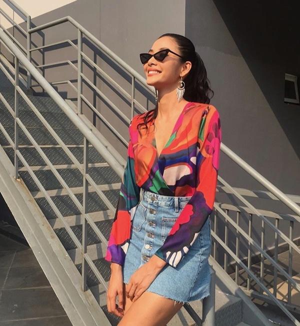 Cũng là chân váy đó, Á hậu đã biến hóa hoàn toàn mới khi mặc cùng áo sơ mi lụa xẻ cổ sâu, họa tiết màu sắc cực kì bắt mắt