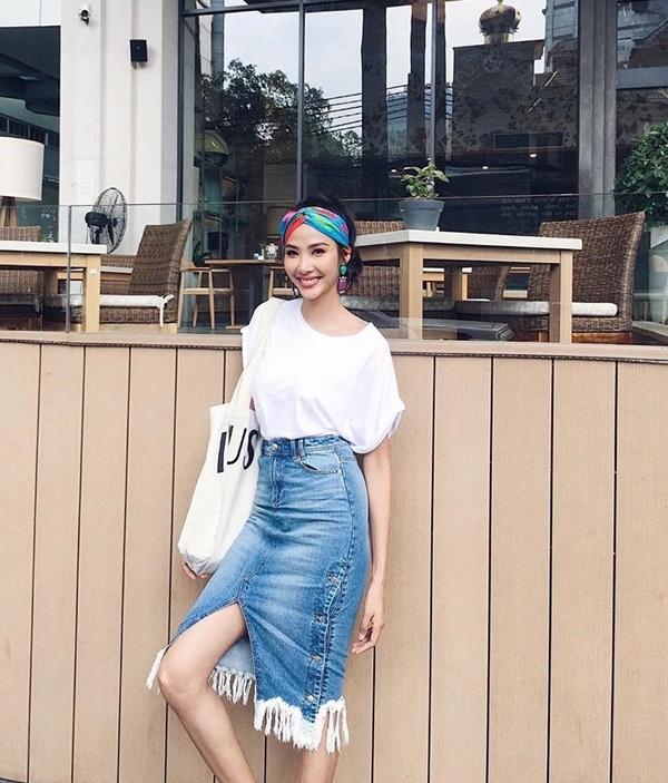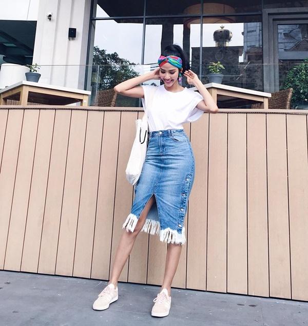 Chiếc váy denim xẻ tà tua rua được Á hậu 9x chọn mặc cùng áo thun trắng trơn oversize đi kèm phụ kiện băng đô buộc tóc. Xách cùng túi tote to bản, cách mix đồ khiến cô nàng khỏe khoắn và rất trẻ trung