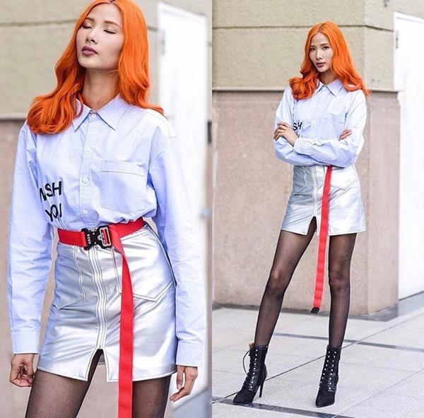 Với váy kéo khóa ánh bạc này, chân dài đã thể hiện mix&match tài tình khi mặc cùng áo sơ mi màu xanh dương nhẹ, điểm nhấn là thắt lưng đỏ và đôi boots đan dây cao gót. Mái tóc màu cam rực nổi bật của cô nàng cũng thu hút sự chú ý.