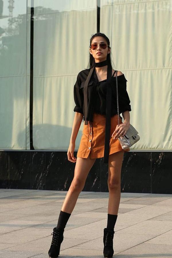 Ngoài chân váy denim thì váy màu bò cũng được Hoàng Thùy thường xuyên sử dụng. Cô mix đơn giản cùng áo sơ mi đen, có thêm joker dài. Đặc biệt Hoàng Thùy rất thích kết hợp chân váy cùng boots nhằm tôn vóc dáng