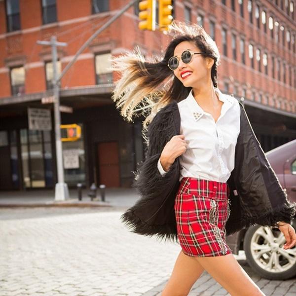 Có thể thấy cách phối đồ của Hoàng Thùy luôn hướng theo tiêu chí đơn giản dễ mặc. Chân váy caro đỏ kết hợp với áo sơ mi trắng kèm theo áo khoác và mắt kính đen đủ giúp chân dài thêm tự tin sải bước trên phố đông.