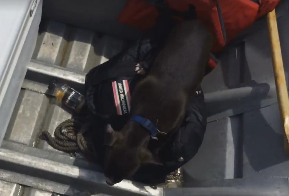Sau khi được cứu, chú chó nằm ngoan trên thuyền cứu hộ