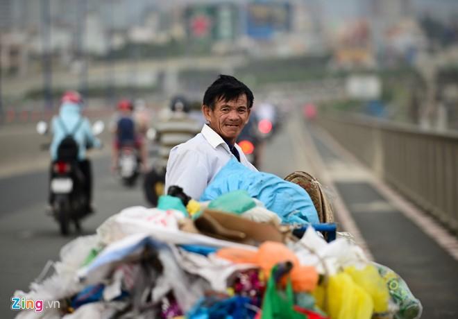 Ông Nguyễn Quang Dạo (quê Quảng Ngãi) vất vả đẩy xe muối iốt qua cầu Sài Gòn. Gió to làm bay những túi nilon khiến ông phải dừng lại.