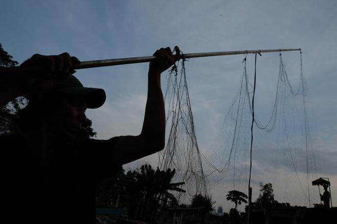 Một cư dân nghĩa trang tranh thủ đan lưới bắt chim khi trời dần tối. Số tiền anh kiếm được