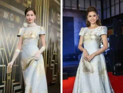 Hương Giang tiếp tục "mặc lại" thiết kế gần giống mẫu váy từng giúp Lý Nhã Kỳ tỏa sáng ở Liên hoan phim Cannes 2018. Đây đều là những thiết kế mới trình làng của Đỗ Long. Nếu như người đẹp chuyển giới yêu kiều thì mỹ nhân họ Lý lại rất quyền lực.