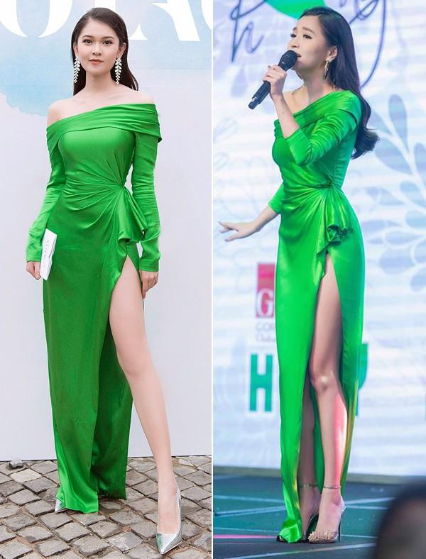 Pha "đụng hàng" lịch sử trong tháng qua chính là thiết kế đầm xanh lá xẻ cao được cả Bích Phương, Thùy Dung yêu thích. Bộ cánh của NTK Lê Thanh Hòa đã giúp cả hai người đẹp khoe vóc dáng không chút mỡ thừa đẹp bất phân thắng bại.