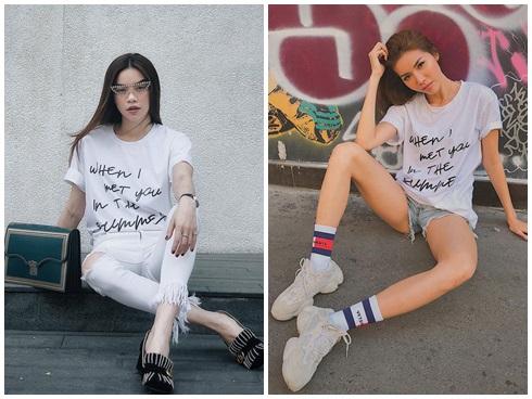 Mẫu áo phông đình đám đang được các mỹ nhân Việt rần rần sở hữu. Đi đầu xu hướng là "nữ hoàng giải trí" Hồ Ngọc Hà. Người đẹp kết hợp ton-sur-ton cả cây trắng cùng phụ kiện kính mắt thời thượng. Trong khi đó, Minh Tú khoe chân dài miên man bằng cách mix áo phông cùng quần shorts theo style giấu quần.