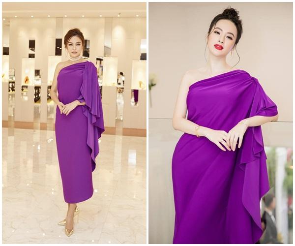 Đụng độ với Angela Phương Trinh mầu đầm tím trendy, Mâu Thủy thất thế bởi cách phối phụ kiện vòng cổ thừa thãi khiến cô trở nên già hơn.