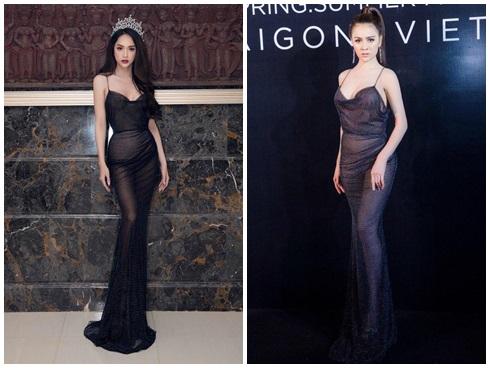 Mở màn tháng 7 là những pha "đụng hàng" liên tiếp của Hoa hậu chuyển giới Hương Giang. Cùng diện chung mẫu đầm xuyên thấu nhưng nhờ vóc dáng thanh mảnh, nữ ca sĩ đẹp lấn át Thư Dung.