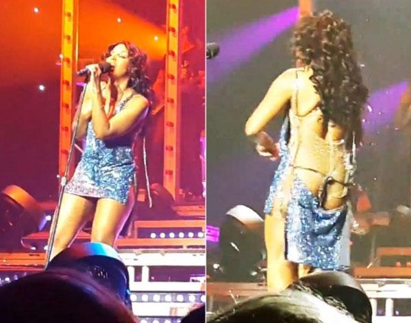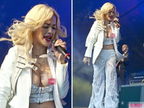 Rita Ora mặc áo thế này biểu diễn khiến bộ ngực của cô sắp "nhảy" ra ngoài.