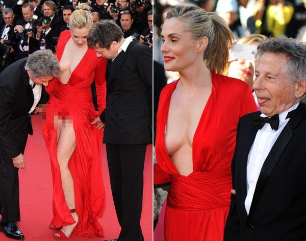 Emmanuelle Seigner mái mê kéo váy mà quên che "phần nhạy cảm:.