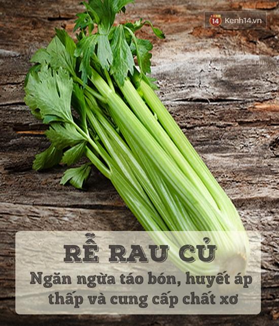 Không chỉ có ở thân mà chính những phần rễ các loại rau như: mùi tây, cần tây, vỏ củ cải cũng rất giàu chất xơ và vitamin C. Chúng có tác dụng giúp ngăn ngừa táo bón, huyết áp thấp. Tuy nhiên, đây là bộ phận cần được làm sạch kĩ để không gây phản tác dụng cho cơ thể.