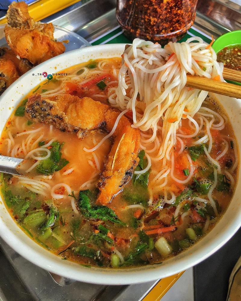 Không như thông thường, cá được cho vào cùng với bún và nước dùng, ở đây cá và bún được ăn riêng cùng một bát nước chấm bên cạnh. Nước chấm của quán khá đặc trưng, đậm đà và hợp miệng.