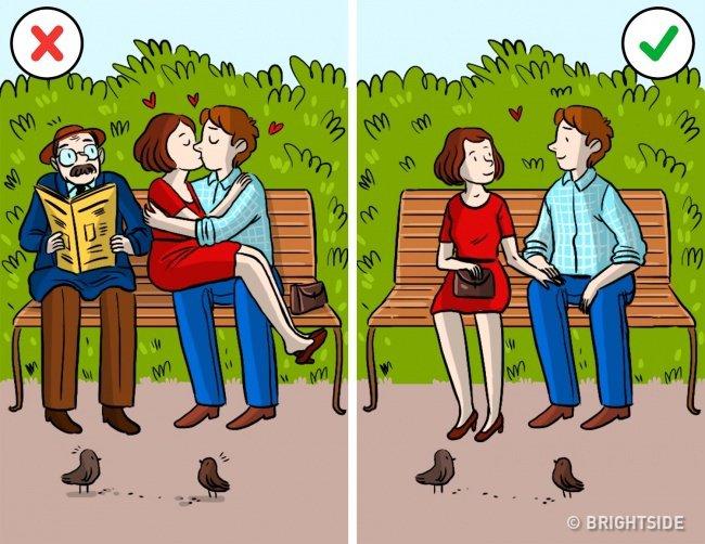 Đối với những cặp đôi mới yêu, có lẽ rất khó để kiềm chế những cảm xúc đang dạt dào trong bạn, dù đó là nơi công cộng. Tuy nhiên cái gì cũng có giới hạn của nó. Có những tình cảm không nên thể hiện nơi công cộng như ôm hôn hay cãi vã.