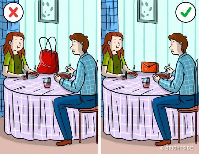 Bạn có hẹn ăn ở nhà hàng trong tối nay? Hãy nhớ chỉ đặt lên bàn những loại túi có kích thước nhỏ như ví cầm tay thôi nhé! Các loại túi xách có kích cỡ lớn nên được treo phía sau ghế hoặc đặt xuống sàn. Bạn cũng không nên giữ thói quen đặt túi xách trên đùi hay kéo một chiếc ghế khác chỉ để đặt túi của mình.