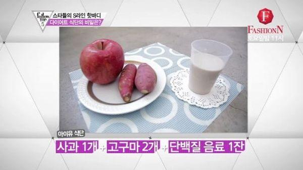 Món ăn chính trong các thực đơn của sao Hàn là khoai lang vì ít chất béo, chủ yếu là bổ sung dinh dưỡng. IU còn đặc biệt thích dùng thêm táo, nước ép táo và sữa ít béo trong các bữa ăn. Theo Dispatch, mỗi ngày nữ ca sĩ đều tuân theo thực đơn như sau: 1 quả táo, 2 củ khoai lang, 1 ly thức uống protein.