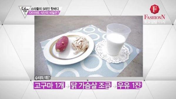 Thực đơn ăn kiêng của Suzy được tiết lộ khiến nhiều người xót xa cho cô. Trước đây, cô nàng thường xuyên bị chê cười vì cặp đùi cột đình, khuôn mặt béo ú vì thừa cân, chính vì vậy Suzy quyết định giảm cân để hoàn thiện bản thân hơn trong mắt khán giả. Được biết, thực đơn của Suzy vào bữa sáng chỉ có 1 củ khoai lang, thịt ức gà xé nhỏ và 1 cốc sữa. Buổi trưa sẽ lót dạ bằng gạo nâu và sa lát, bữa tối ăn càng ít càng tốt, hai củ khoai lang là đủ tiêu chuẩn. Song song với chế độ ăn này là việc tập luyện thể dục, thể hình nghiêm khắc.