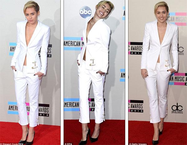 Xuất hiện tại sự kiện âm nhạc mới đây, nữ ca sĩ trẻ Miely Cyrus lại mang đến hình ảnh đầy gợi cảm cho người hâm mộ khi cô diện bộ vest màu trắng kết hợp giày đen cao gót và đặc biệt "thả rông" vòng một đứng tạo dáng trên thảm đỏ.