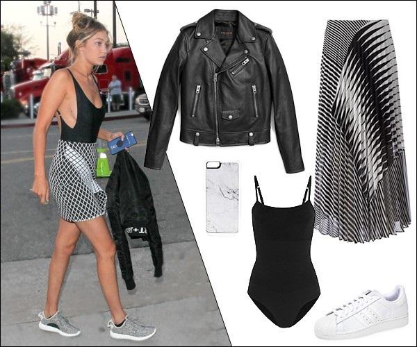 Gigi Hadid năng động với bộ bodysuit xám kéo khóa cùng quần jean rách cá tính.